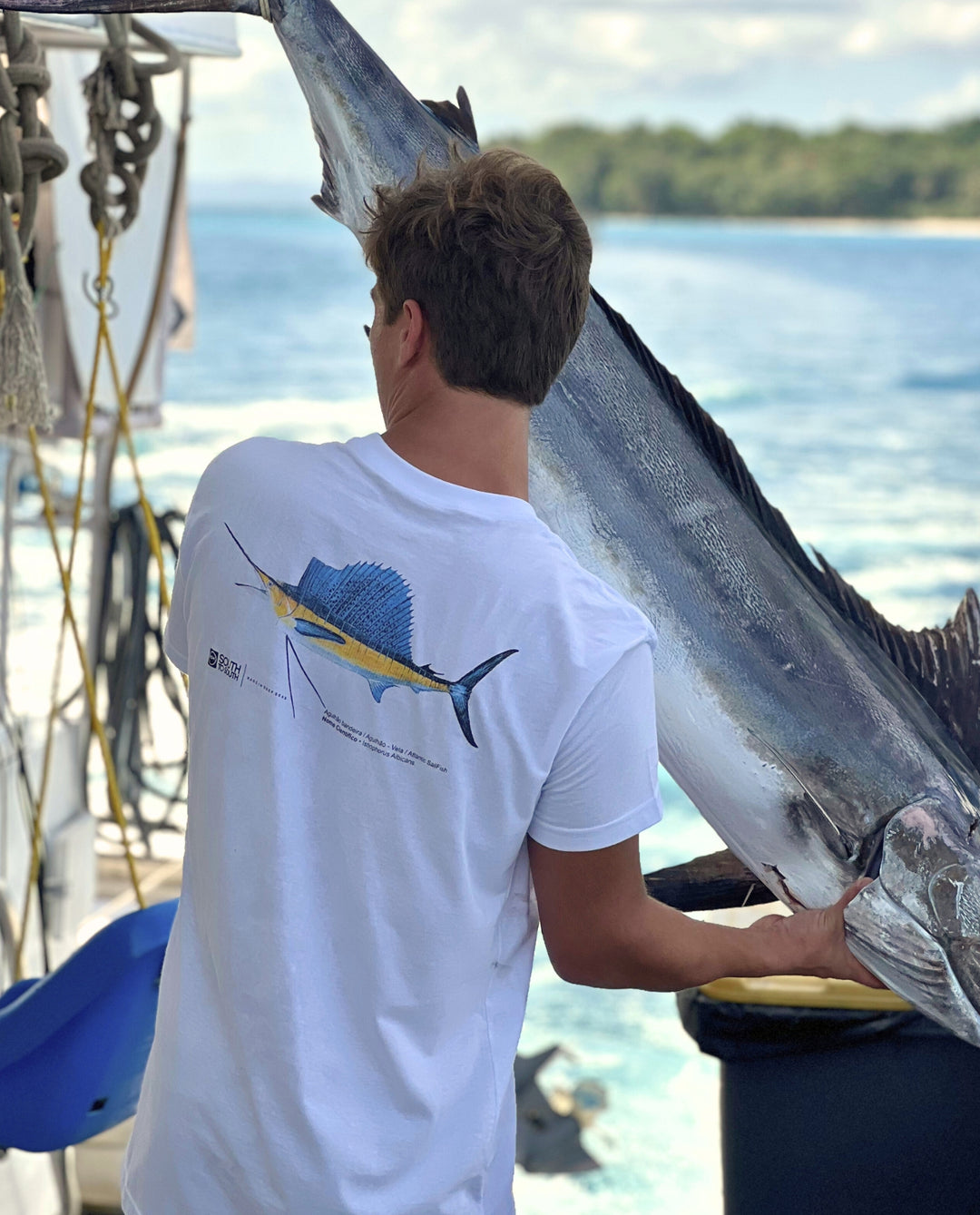 Camiseta "Sail Fish" confeccionada em malha Vellutato, 100% algodão. Esse artigo recebe beneficiamento peletizado exclusivo, que proporciona um toque extremamente macio.