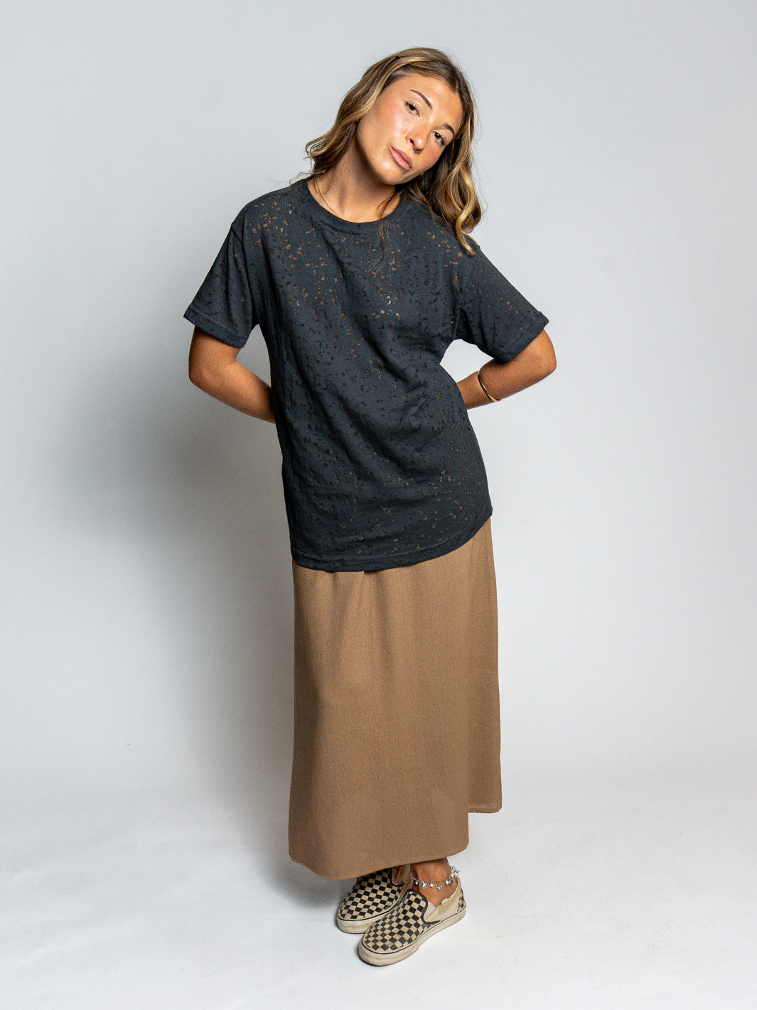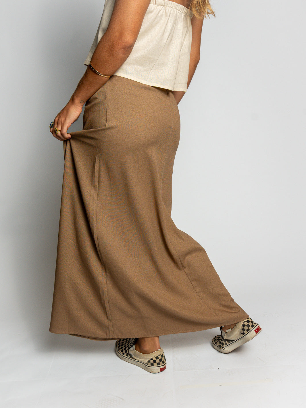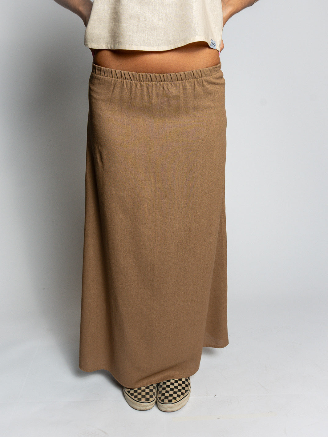 Saia longa com caimento leve e fluidez.