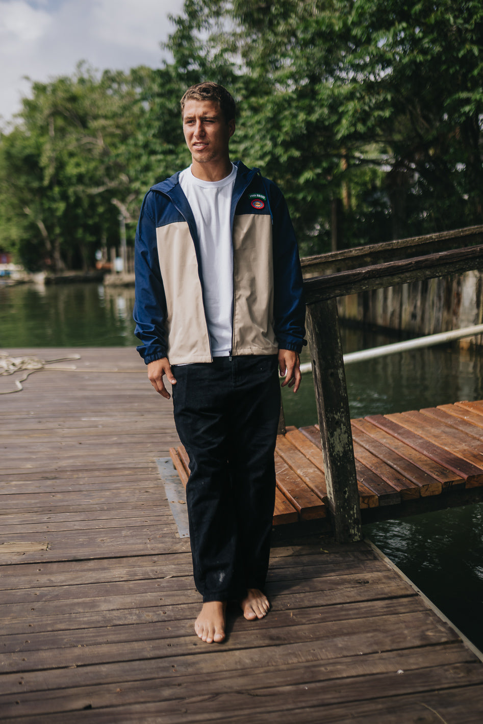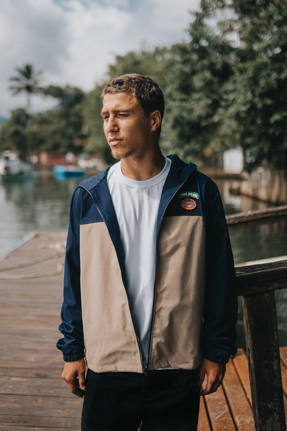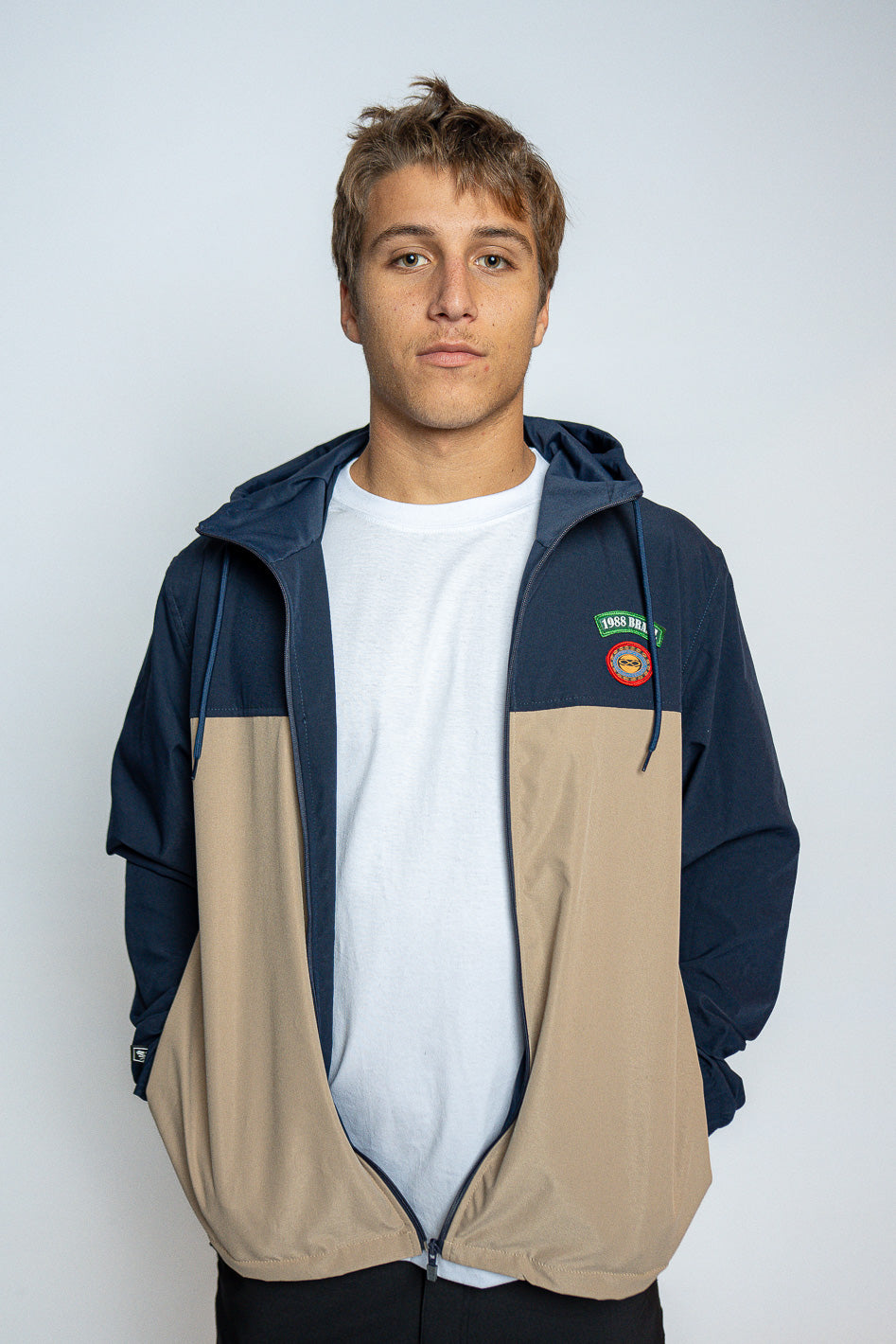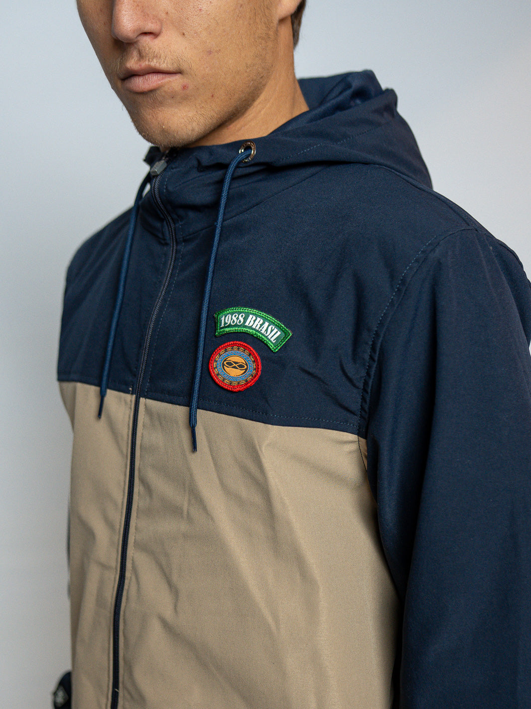 Corta-vento com construção mais encorpada, pensada para proteger sem abrir mão do conforto no dia a dia. Modelo com recorte em blocos de cor, capuz com ajuste por cordão e fechamento frontal em zíper. Possui dois bolsos laterais funcionais e patch aplicado no peito, reforçando a identidade da peça.