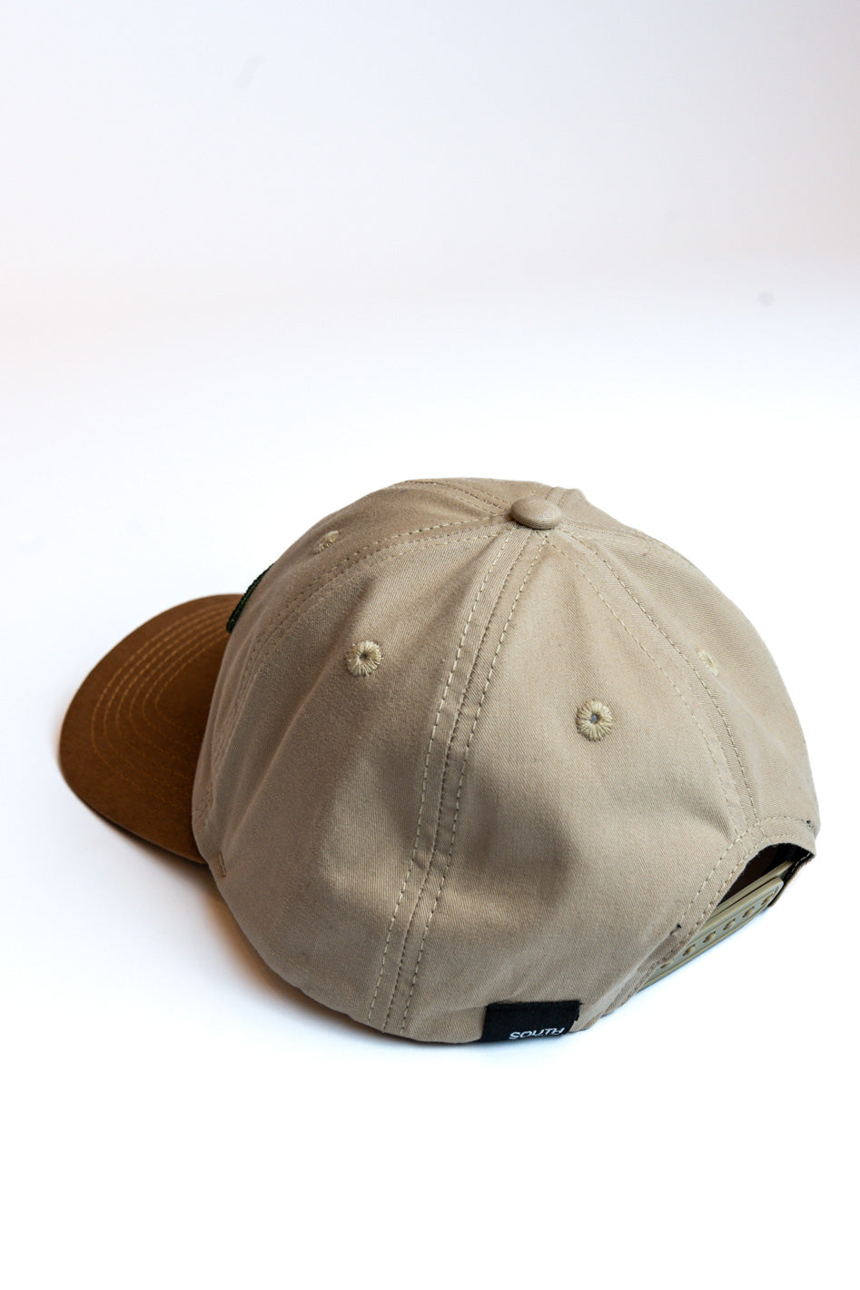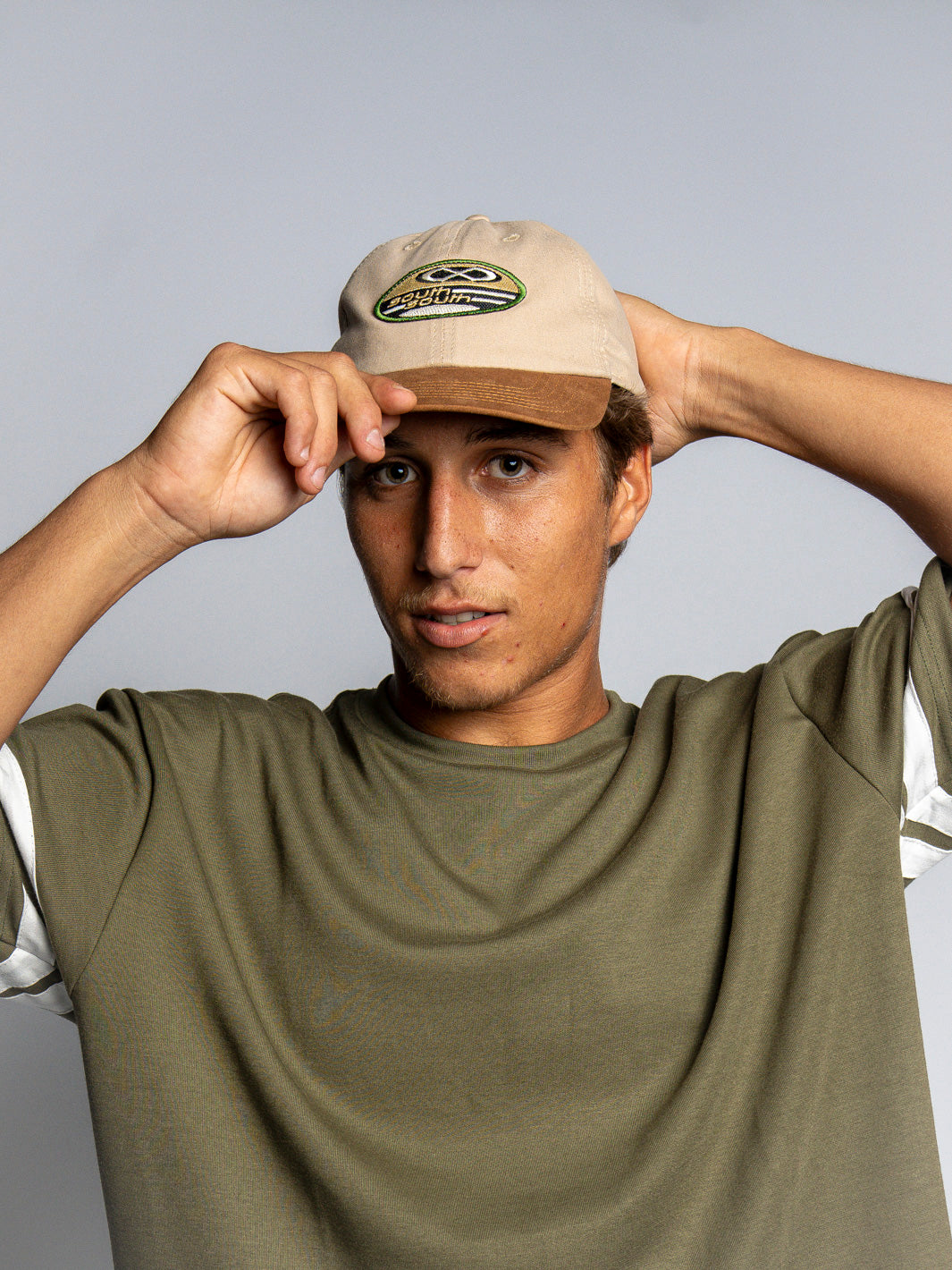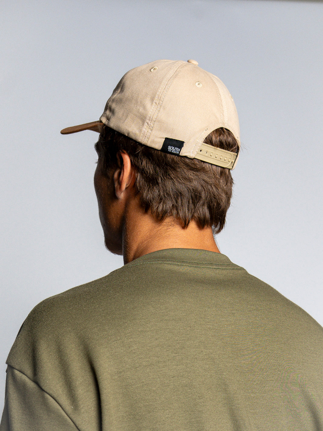 Boné Dad Hat, com aba curva na cor "areia", 100% Algodão, com Patch vintage na frente.