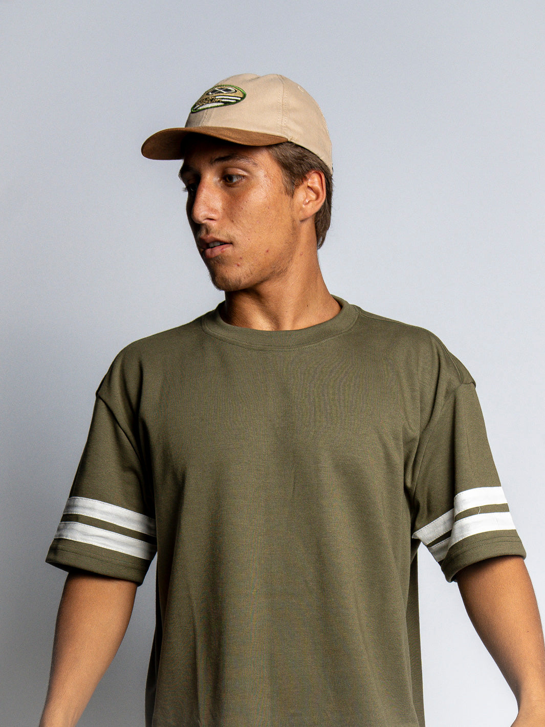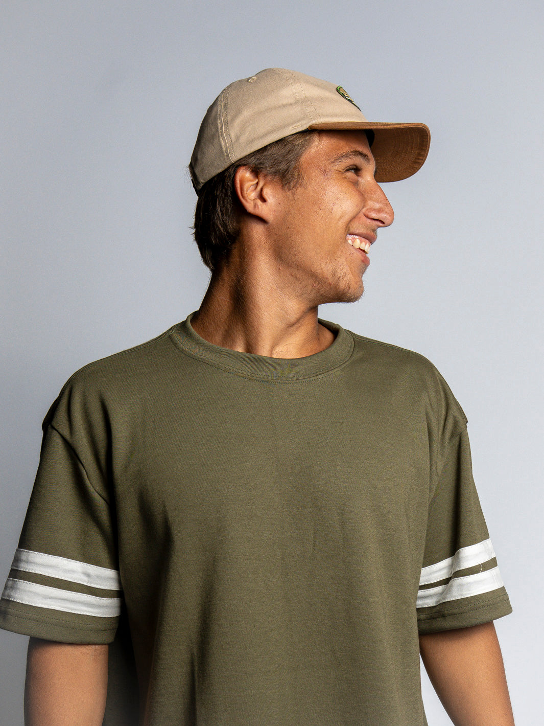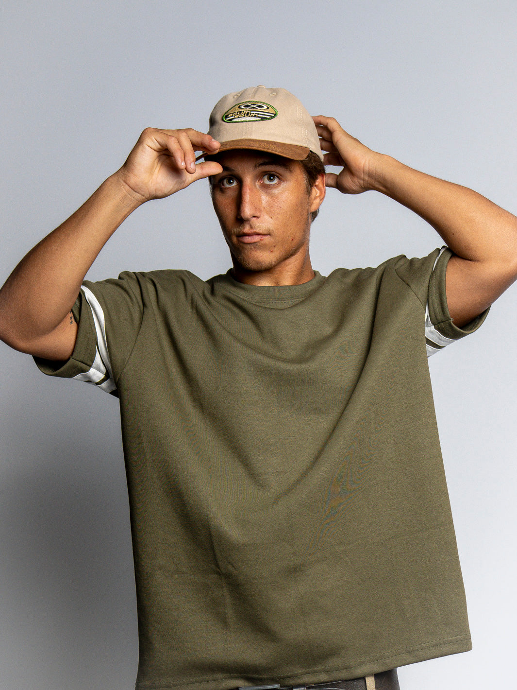 Boné Dad Hat, com aba curva na cor "areia", 100% Algodão, com Patch vintage na frente.