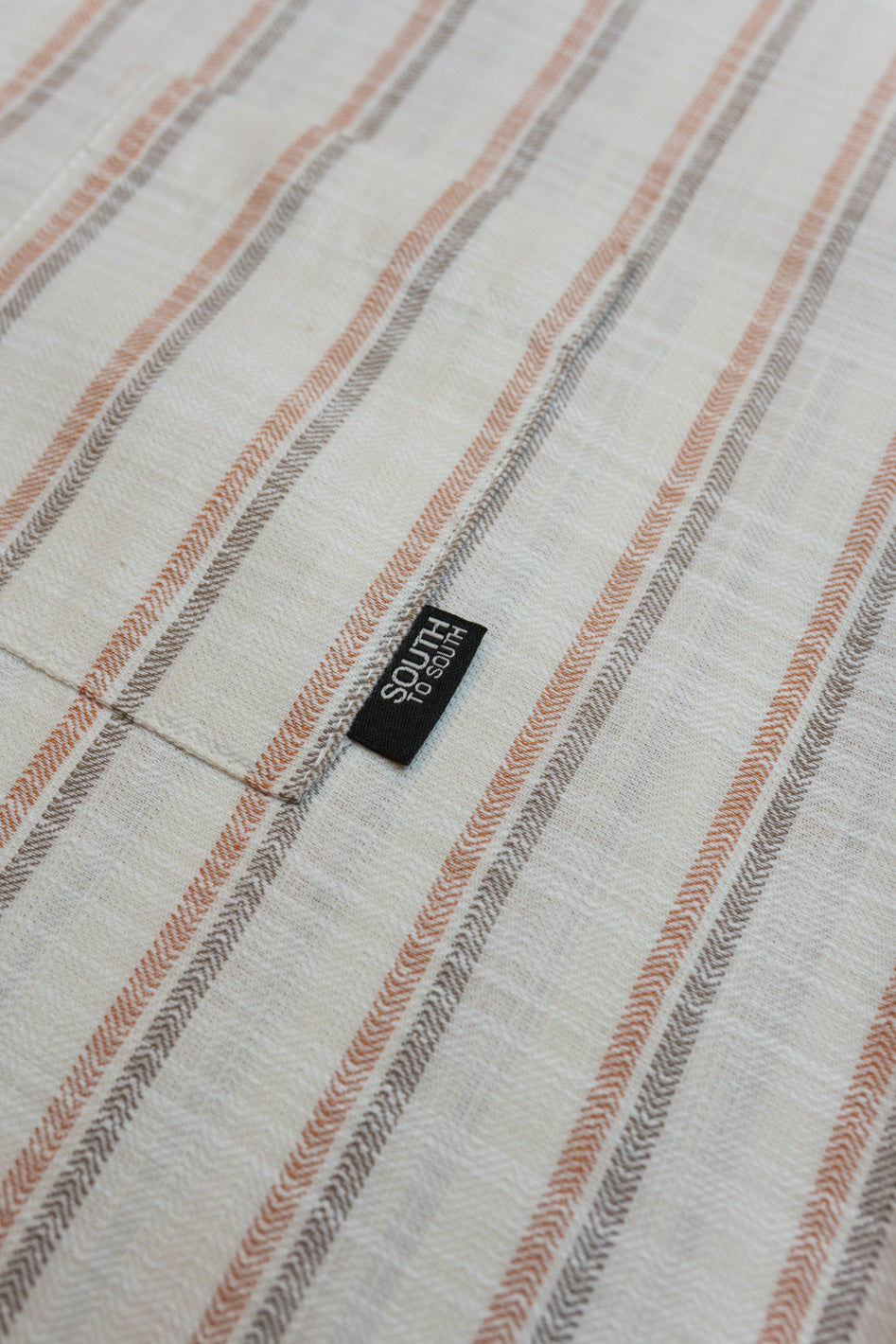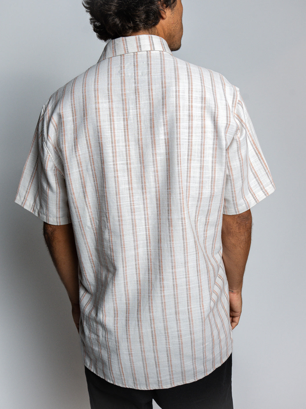 Camisa "Tropical Culture" é feita em tecido plano listrado, com nossa modelagem clássica. Leve e confortável. Mais uma camisa perfeita para qualquer viagem, saída ou dia-dia.